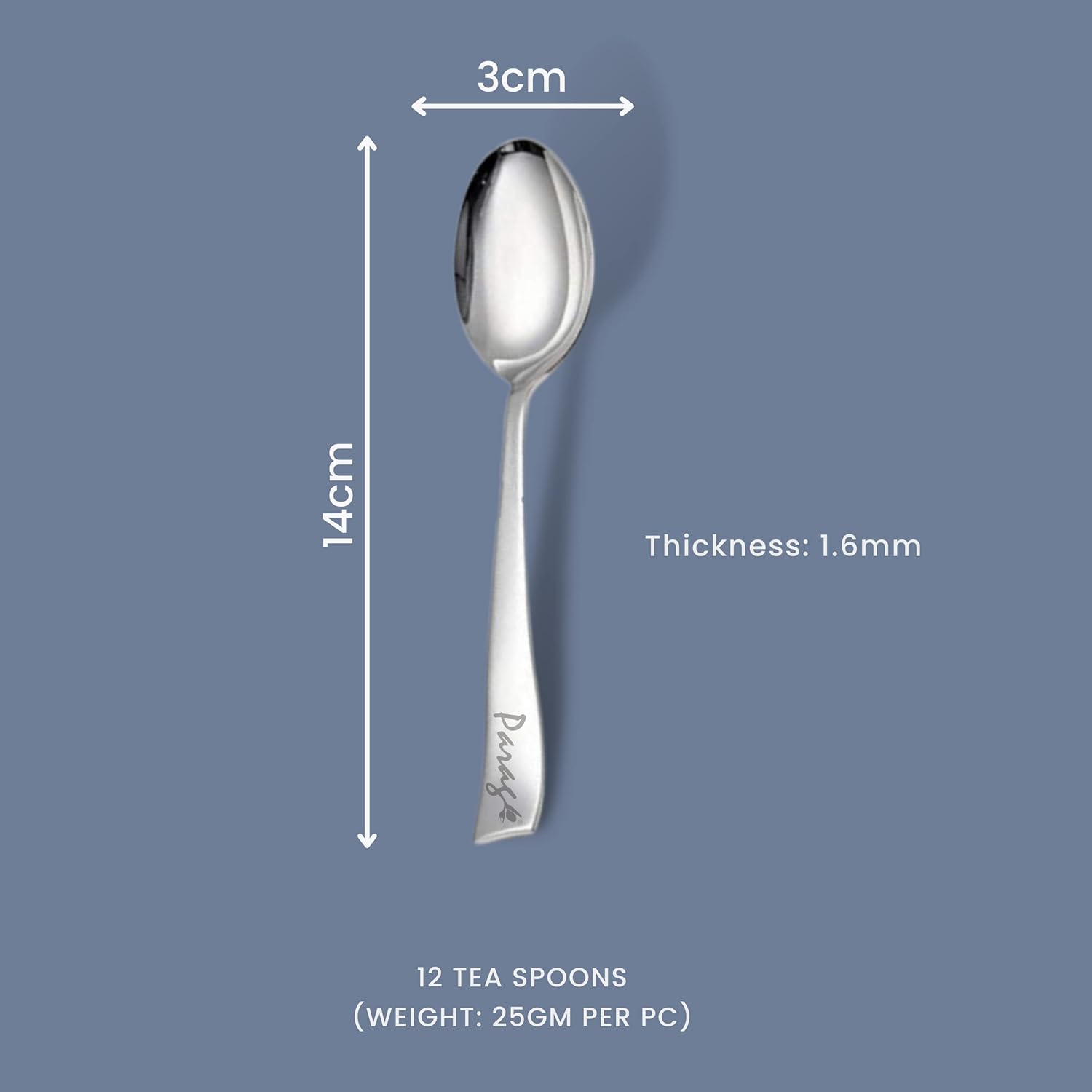 This set of 12 stainless steel tea spoons is designed for precision and durability, measuring 14.5 cm in length with a 1.8 mm thickness. Ideal for stirring tea, coffee, or measuring sugar and spices, these silver spoons combine practical size with a sturdy build. Their corrosion-resistant material ensures long-lasting use while maintaining a sleek appearance, making them a reliable addition to any kitchen or dining set.