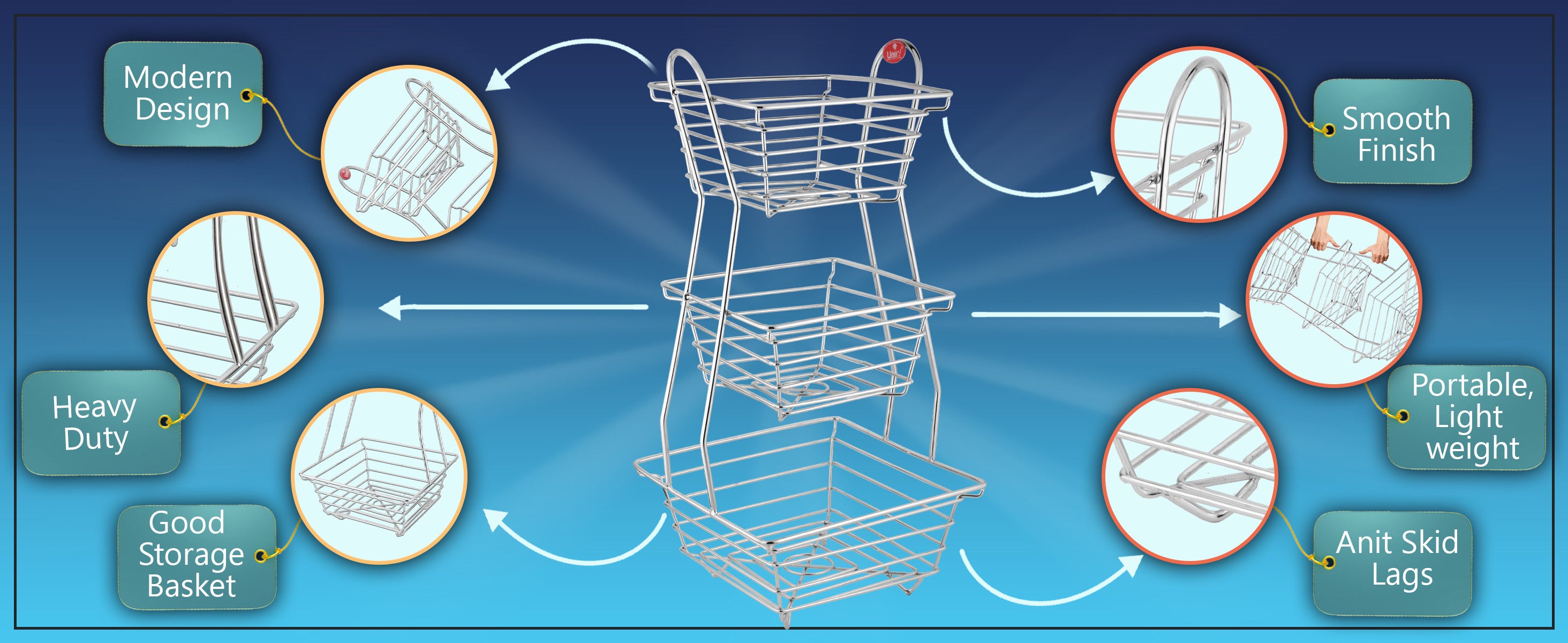 Elevate your kitchen organization with the 3-Tier Stainless Steel Fruit Basket. Its sturdy square design efficiently maximizes countertop space while providing ample room to store fruits and vegetables. Crafted from durable stainless steel, it resists rust and ensures long-lasting use. Ideal for kitchen and dining tables, this multi-level stand keeps produce accessible and neatly displayed, promoting a clutter-free environment and easy meal prep.