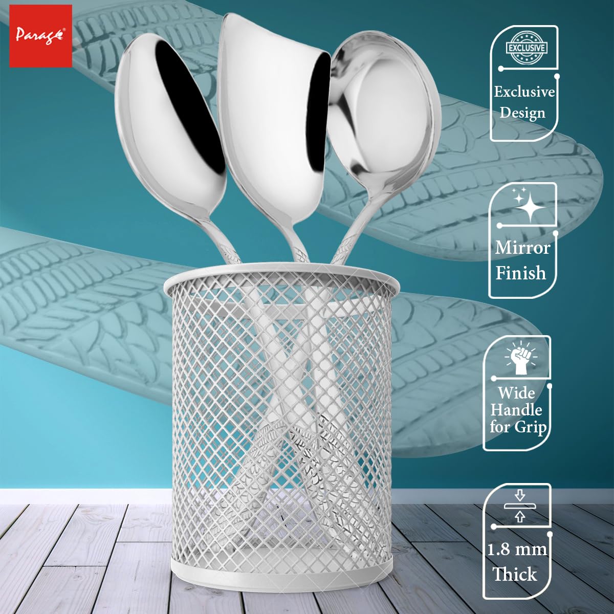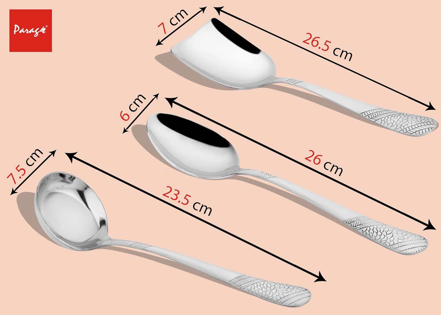 - CONTENTS: 1 Deep Ladle (Karcchi) for soup, rasam, dal, etc, 1 Solid Spoon (Chamcha) for pouring gravy dishes, 1 rice spoon to serve rice