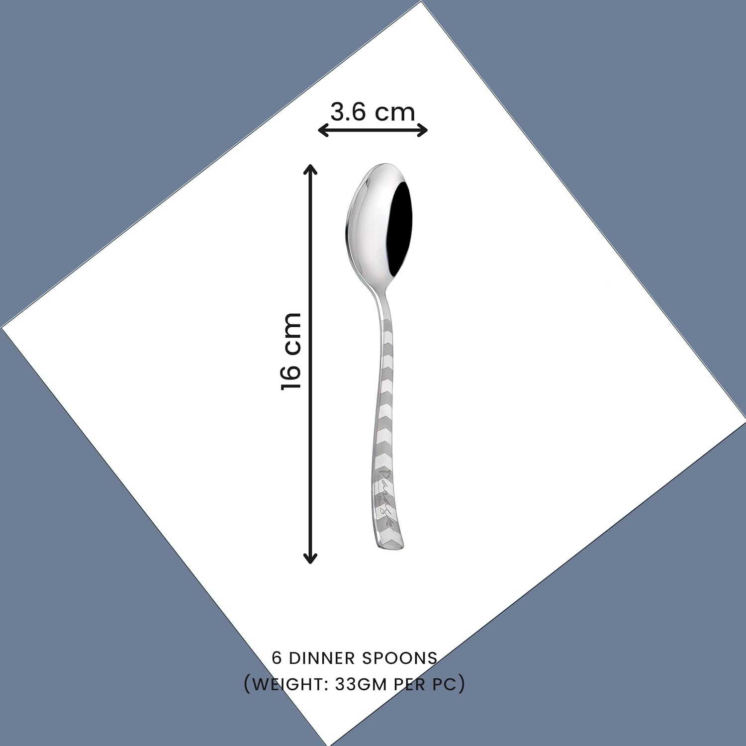Stainless Steel Spoon Set of 6 | Arrow Design Dinner Spoons for Home & Kitchen | 16 cm, Silver