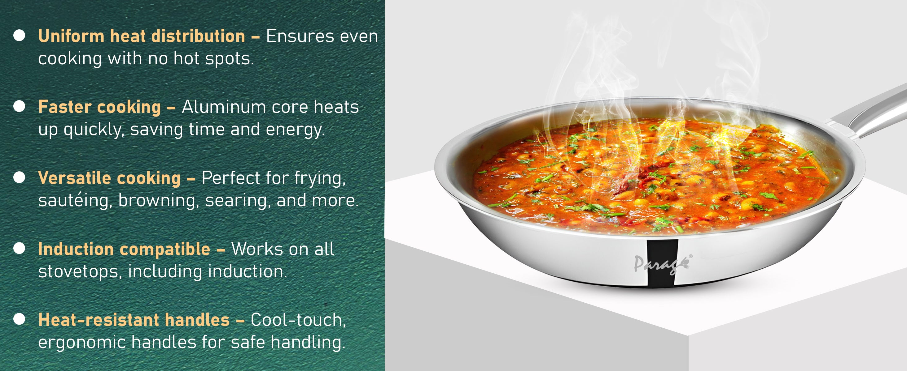- ADVANCED HEAT DISTRIBUTION FOR FASTER COOKING: Engineered with premium tri-ply stainless steel construction, this fry pan ensures fast and efficient cooking. The thick aluminum core sandwiched between two layers of stainless steel eliminates hot spots and distributes heat evenly across the surface. It helps reduce cooking time by up to 20% compared to regular stainless steel pans, making it ideal for everyday use on gas and induction cooktops.