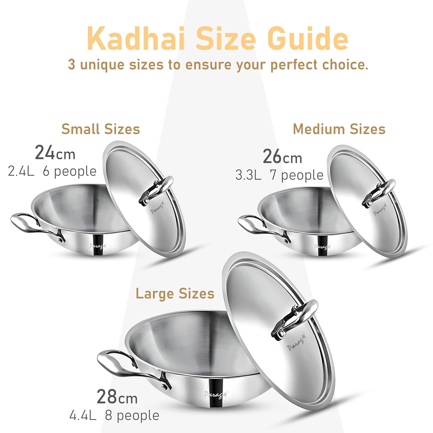 - Durable Stainless Steel Kadai with Lid - Parage Tripure kadai is made with high-quality stainless steel layers for lasting performance. The strong base ensures even contact with gas and induction cooktops for consistent cooking. Great for deep frying, sautéing, and making everyday meals. A must-have kadai for cooking.