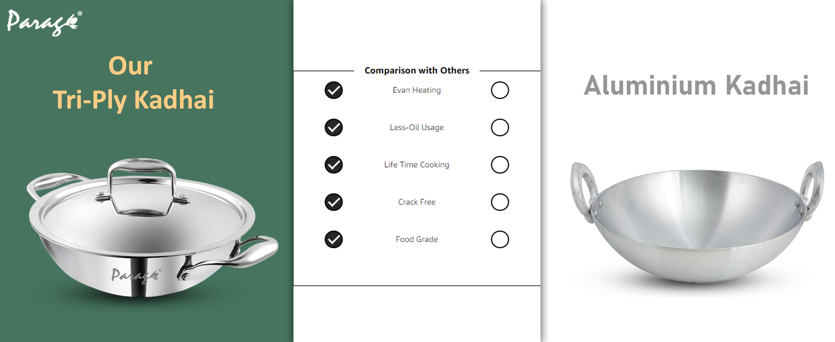 - Durable Stainless Steel Kadai with Lid - Parage Tripure kadai is made with high-quality stainless steel layers for lasting performance. The strong base ensures even contact with gas and induction cooktops for consistent cooking. Great for deep frying, sautéing, and making everyday meals. A must-have kadai for cooking.