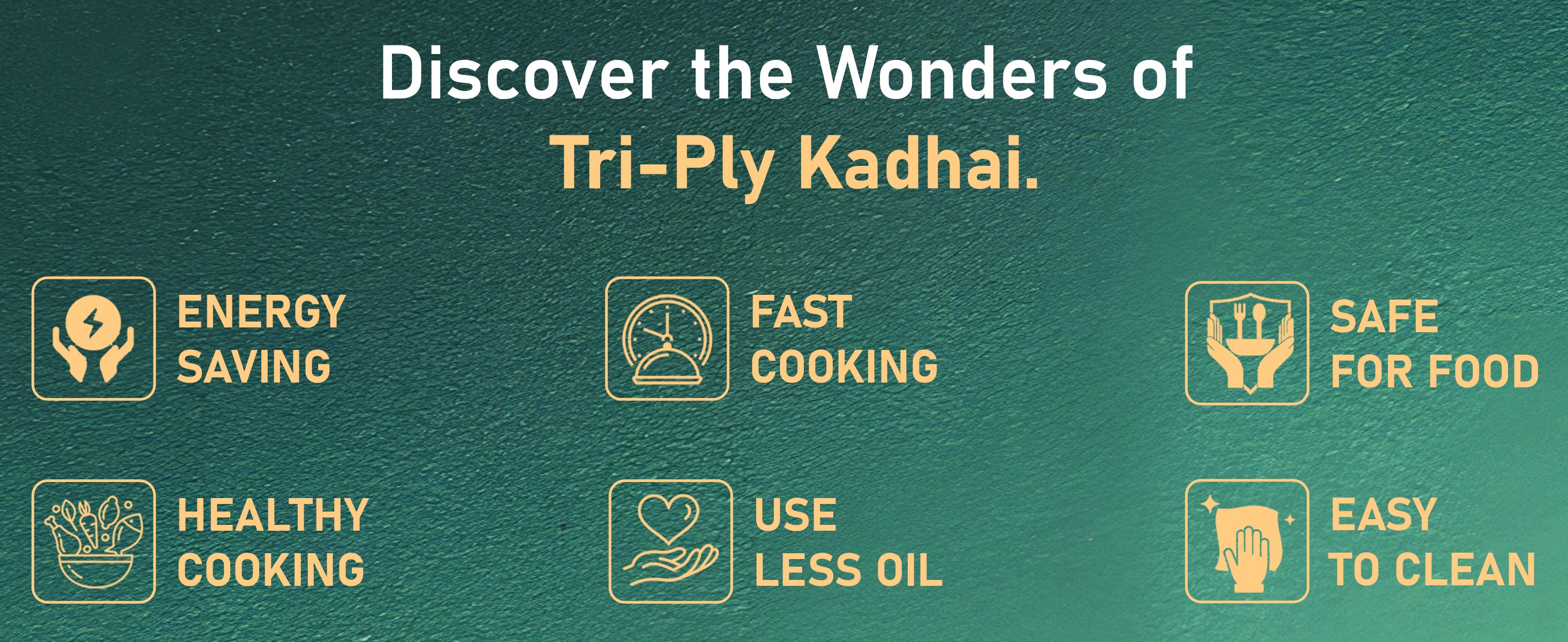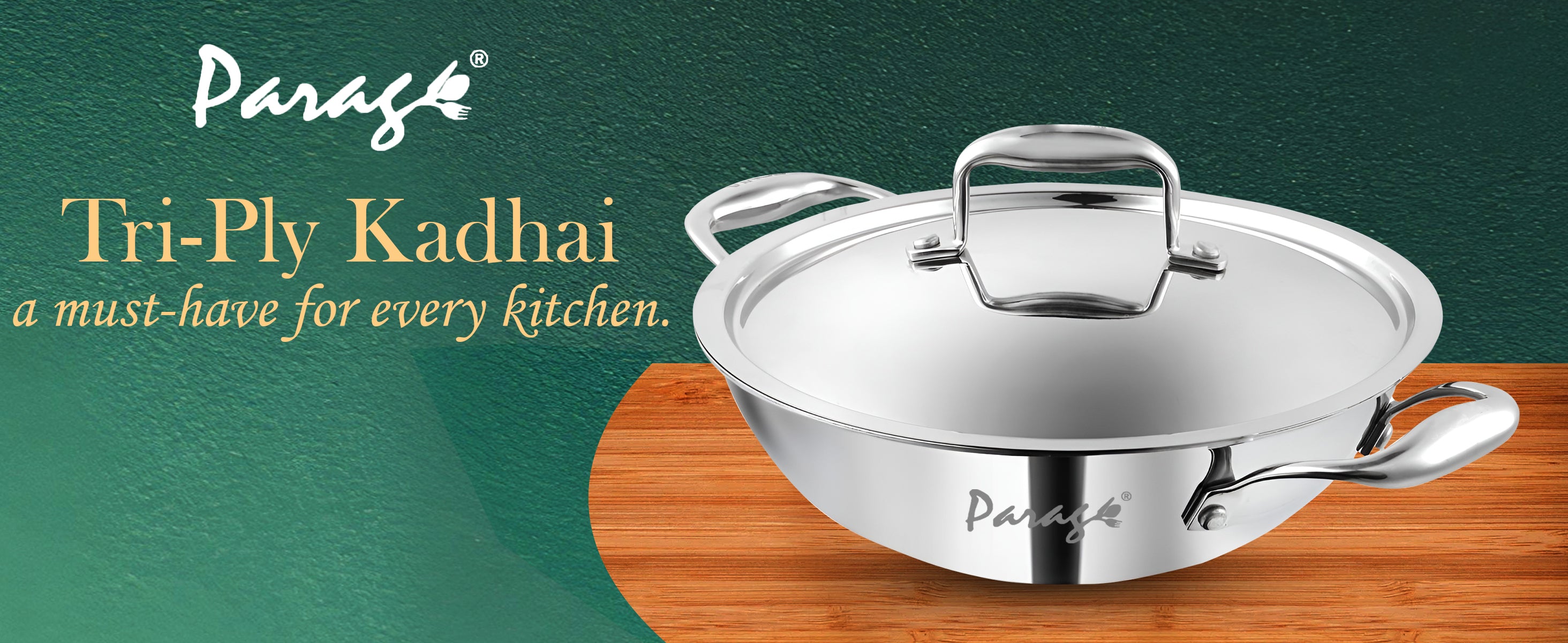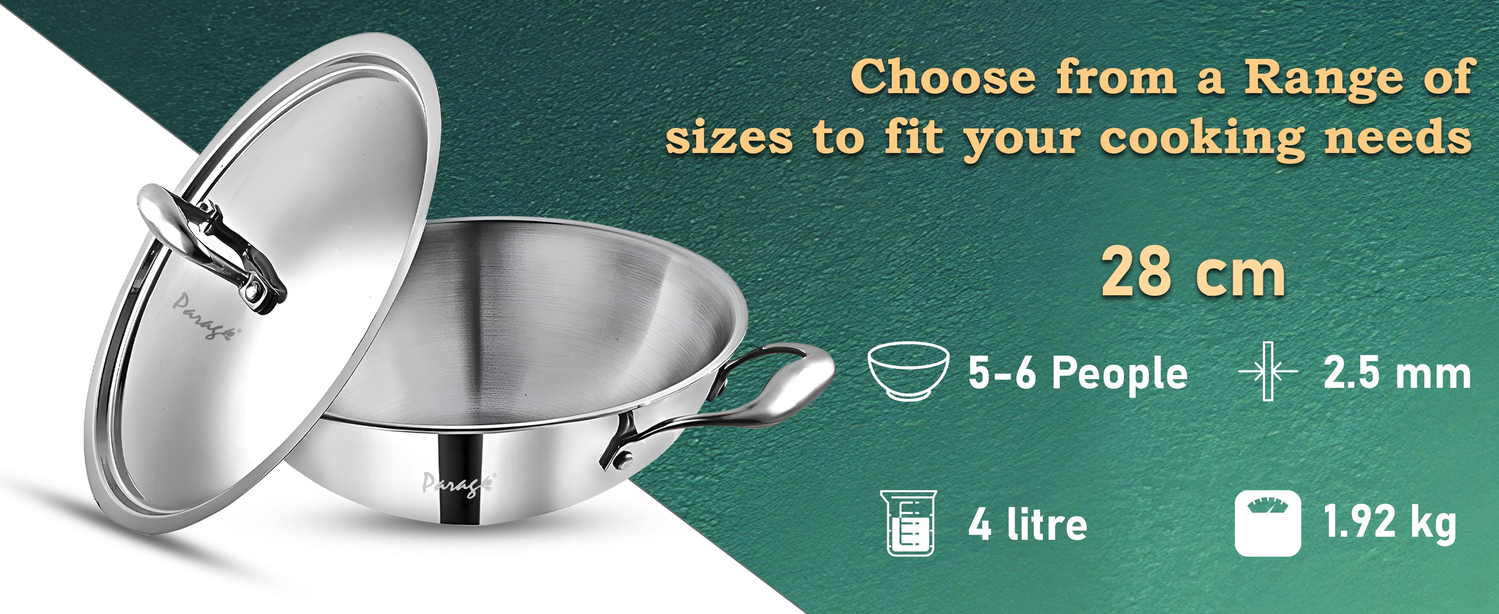 - Durable Stainless Steel Kadai with Lid - Parage Tripure kadai is made with high-quality stainless steel layers for lasting performance. The strong base ensures even contact with gas and induction cooktops for consistent cooking. Great for deep frying, sautéing, and making everyday meals. A must-have kadai for cooking.